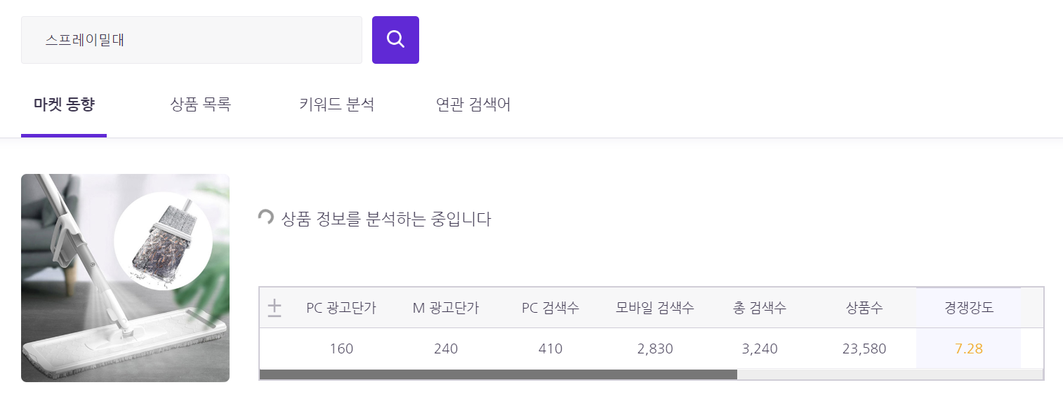 청소 용품 "밀대"를 검색 해 보면, 총 검색수 대비 상품수가 상당히 많은걸 알수 있습니다.
