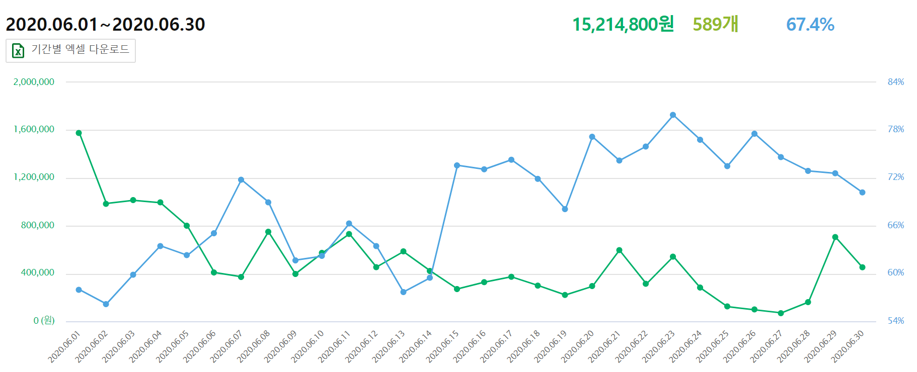 쿠팡 매출 현황입니다. 6월 총 매출액이 15,214,800원 입니다.