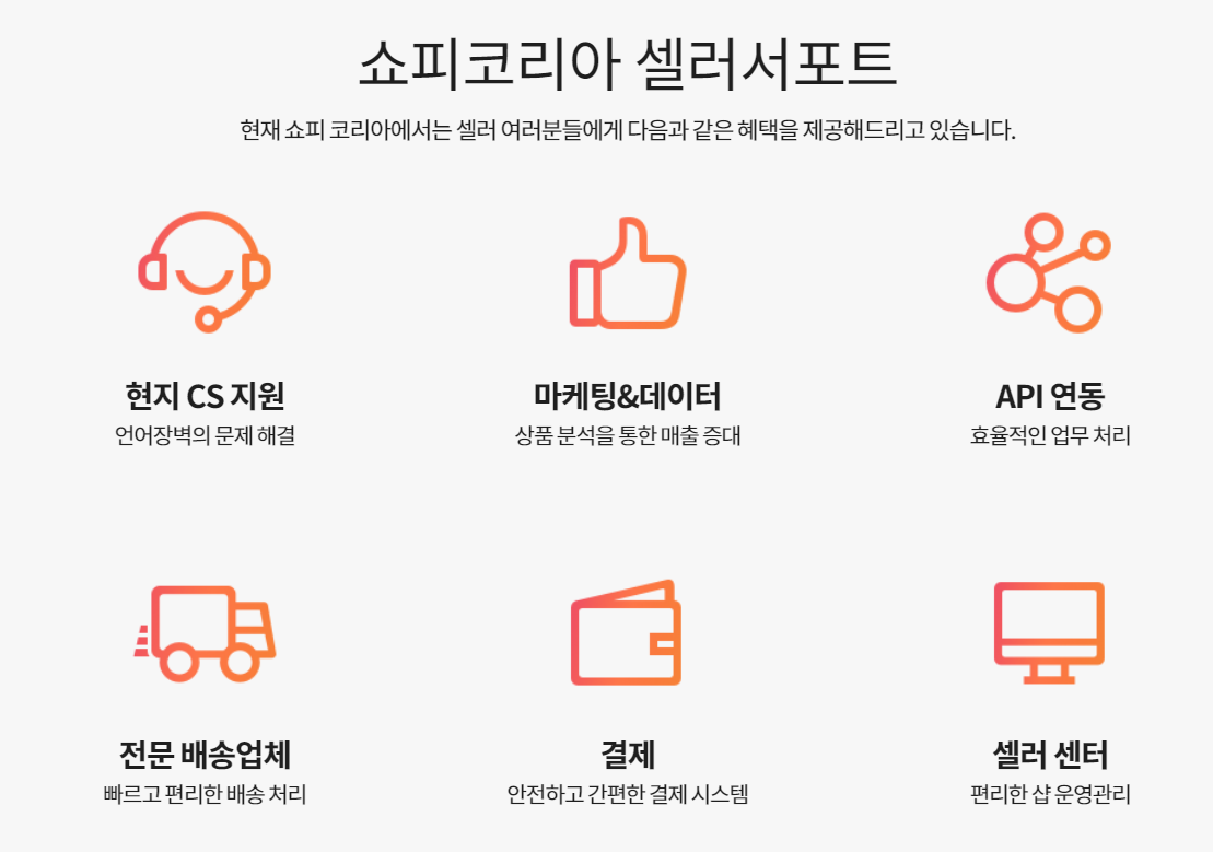처음에 해외 온라인 판매에 익숙하지 않은 사업자들에게 강의, 업로드 방법, 상품 배송 방법, 마케팅 지원 등 이런 여러 가지 업무를 서포트를 해줍니다. 이런 지원 때문에 초보 글로벌 셀러라도 쉽게 시장에 진입이 가능하게 됩니다.