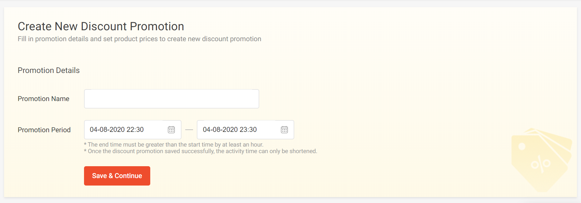 2) 프로모션 명 및 기간을 설정해주고 "Save & Continue" 버튼을 눌러 줍니다.