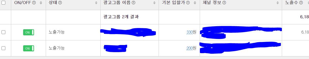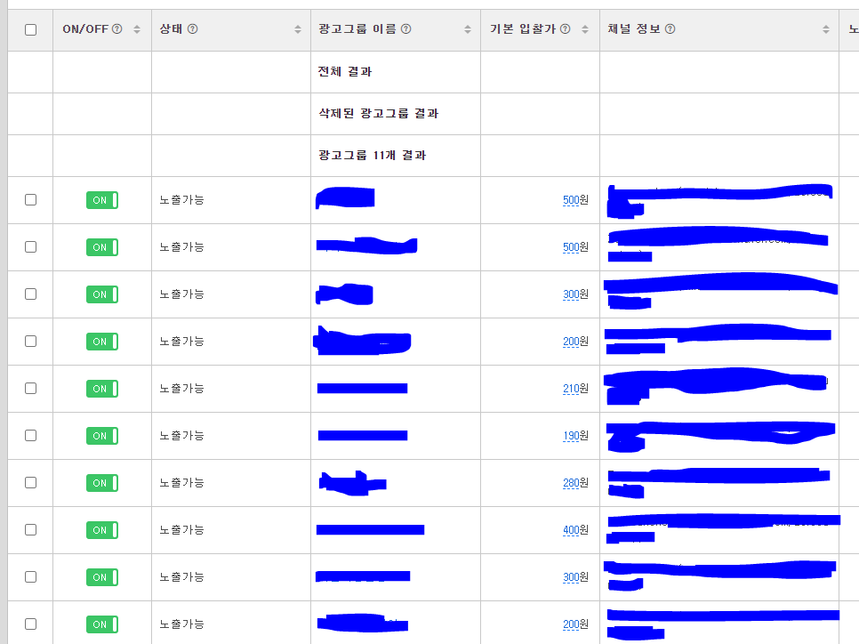 만약 입찰가격을 안 나누어 놓았다면, 11개의 키워드를 검색하고 클릭을 했을때 500원이라는 입찰가격이 지출이 되는 거예요.. 그러면 이게 누적이 되면 엄청난 비용이 광고비로 빠지겠죠?