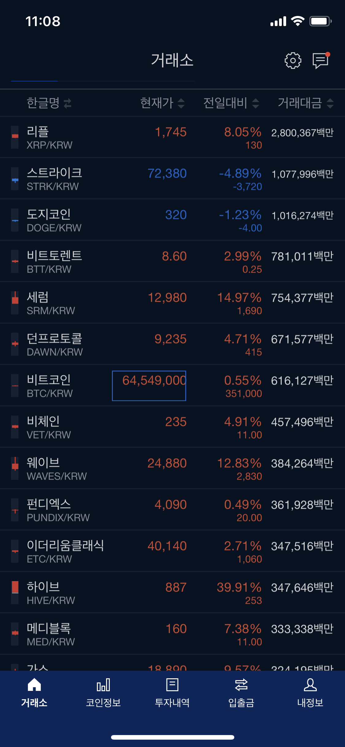 대부분의 코인들이 빨간색 불빛으로 변경이 되면서, 비트코인의 반등에 맞추어서 반등을 하고 있습니다.