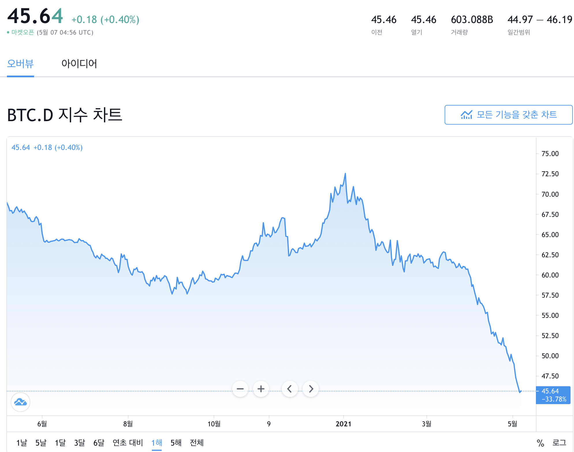 비트코인 도미넌스 45% 횡보 진행, 메이져 알트 코인 강세